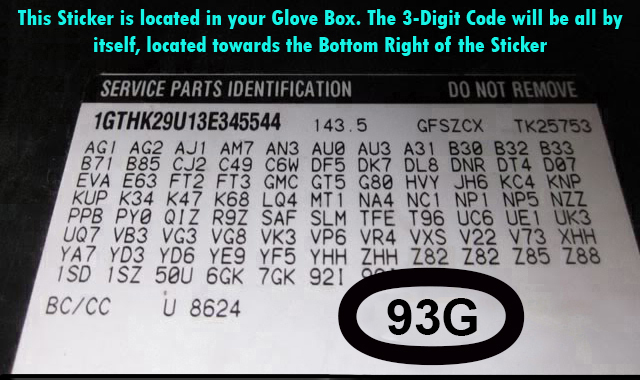 | 3-Digit Interior Trim Number | 93G, 93W, 93V, 93C (Code is on Service Parts Identification sticker) |