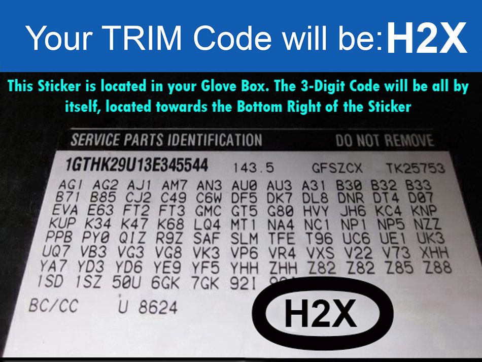 | 3-Digit Interior Trim Number | H2X (Code is on Sticker Inside Glove Box) |