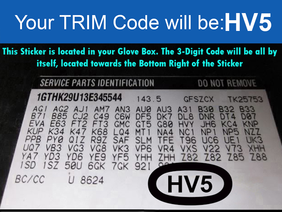 | 3-Digit Interior Trim Number | HV5 (Code is on Sticker Inside Glove Box) |