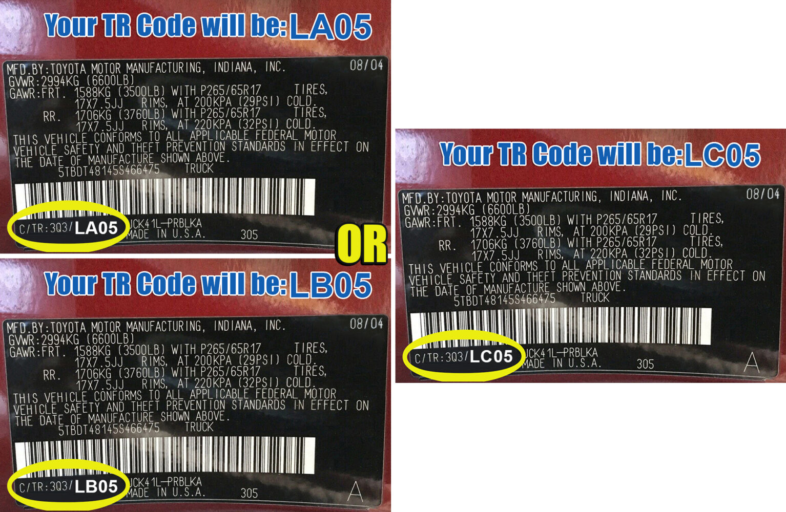 | TR Code (Interior Trim) | LA05, LB05 or LC05 (This Code is on your Vin Number Sticker) |