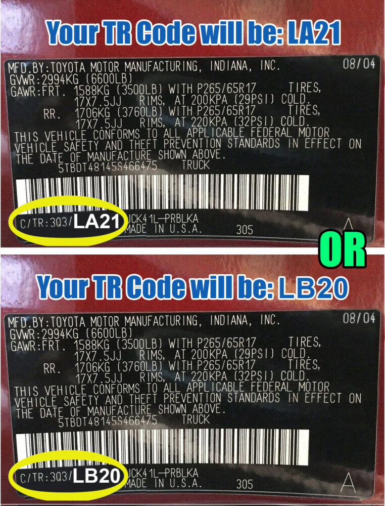 | TR Code (Interior Trim) | LA20, LA21, LB20 or LC20 (This Code is on your Vin Number Sticker) |