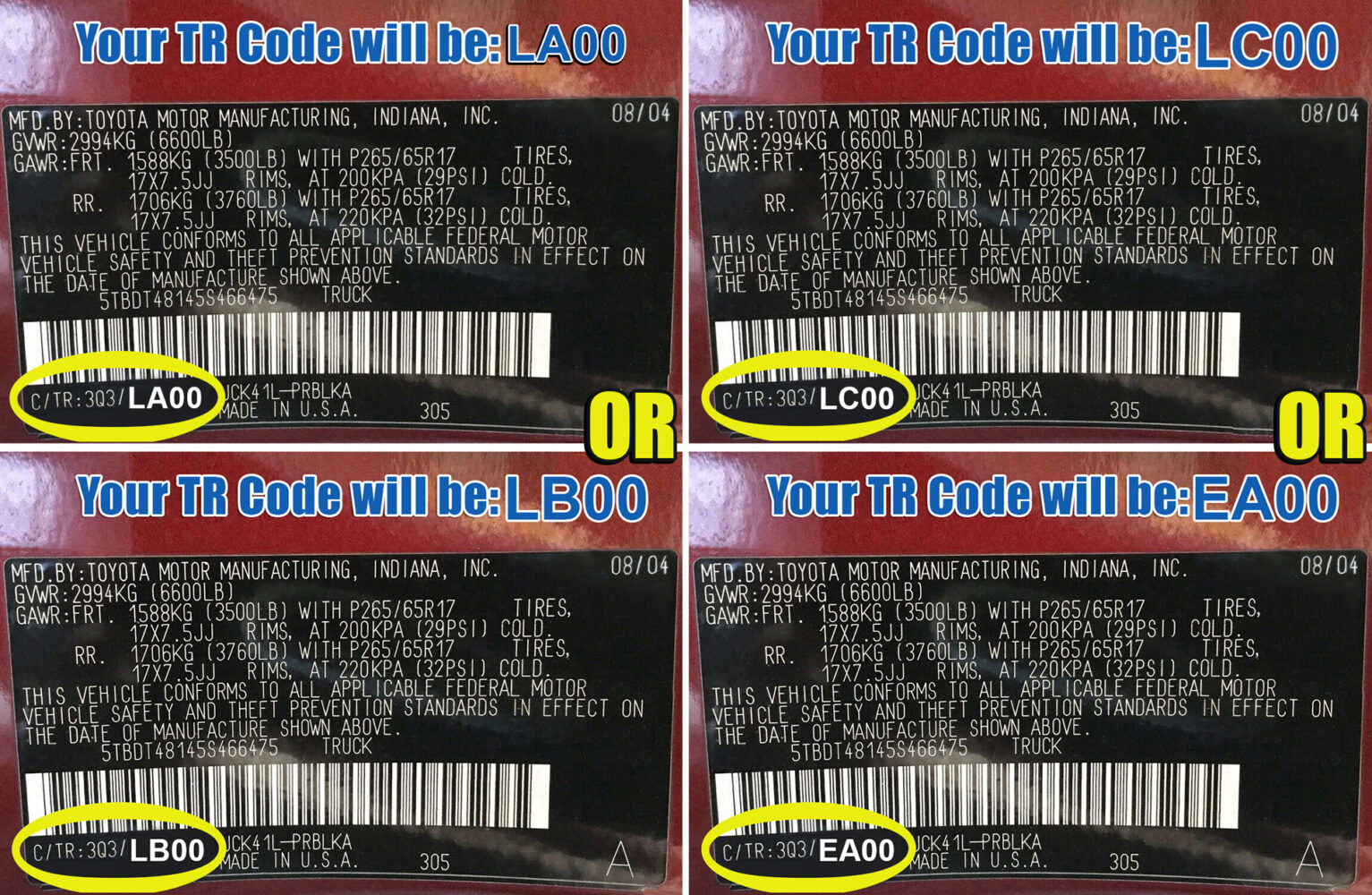 | TR Code (Interior Trim) | LA00, LB00, LC00 or EA00 (This Code is on your Vin Number Sticker) |