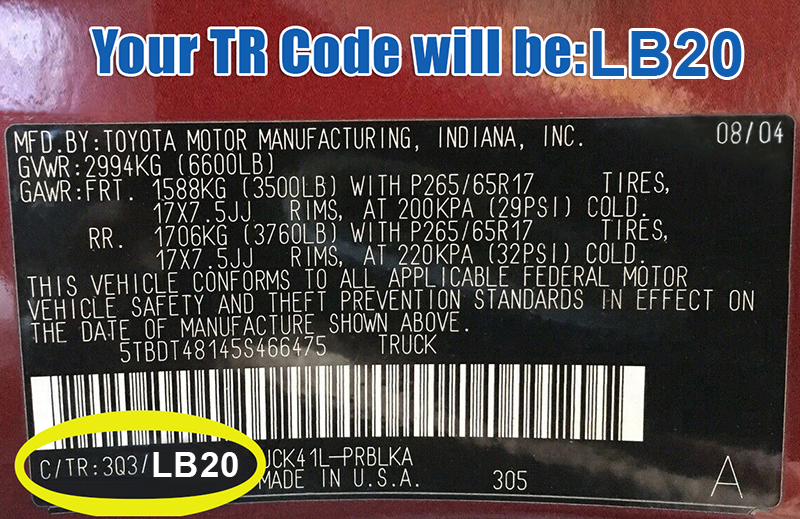 | TR Code (Interior Trim) | LA20 or LB20 (This Code is on your Vin Number Sticker) |